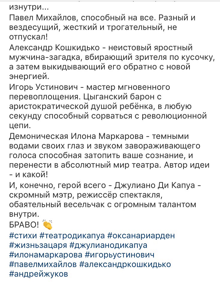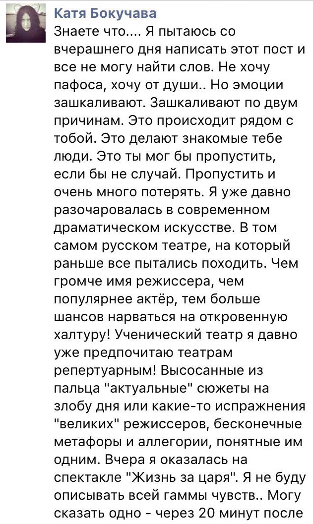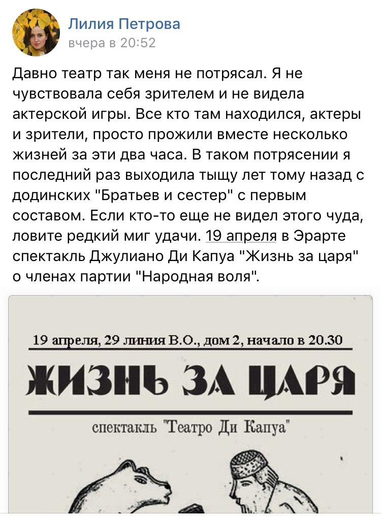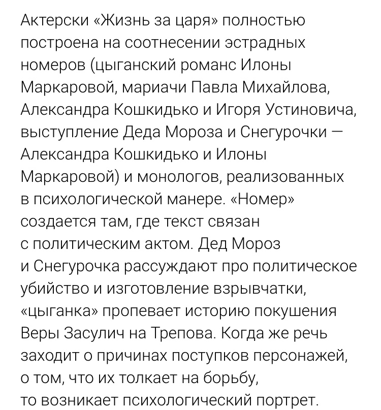 «Жизнь за царя» – беспрецедентное явление в театральной жизни Петербурга. Художественная постановка по историческим документам, намеренно уходящая (почти хлопая дверью) из театрального пространства, но использующая, вызывающе и намеренно – именно театральные, приёмы воздействия.
