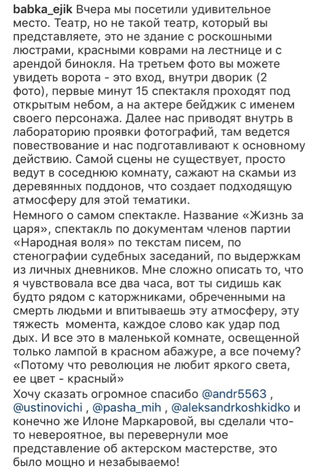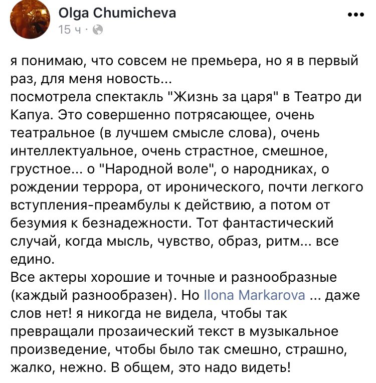 И, вот, вы уже не понимаете на чьей вы стороне. С какой стороны? Как в формально-театральном, так и в политическом, если хотите смысле. Кто они эти люди, что изменили историю? А может, это мы? Спектакль ставит больше вопросов, чем даёт ответов. Лично для меня это очень ценно. Не назидание или фетиш, а вопрос, на который зритель ответит сам. Каждый по-своему. Разве не в этом свобода мысли? Разве не это – свободомыслие и интеллектуальная честность? Накал, которого достигают участники действия, иногда становится буквально невыносимым. Но разве не в этом реализм? Реализм художественный и творческий, а не жалкая копирка социалистического реализма. Ведь люди, о которых и сделан спектакль – жили в этом накале и делали то, что считали для себя единственным и верным. Кто из нынешних политических деятелей может похвалиться этим? В этом смысле – совсем непонятна реакция, так называемой театральной критики. Да и важна ли она? Будут ли хвалить или проклинать постановку, движущей силой которой выступила одна из самых талантливых актрис Санкт-Петербурга – Илона Маркарова – уже не важно! Ясно одно: то, что это незаурядная, актуальная и невероятно захватывающая попытка постижения Русской Революции через историю первой принципиально-террористической партии в мире, через судьбу её участников, через нарочито выставленные театральные приёмы, является единственной в своём роде.