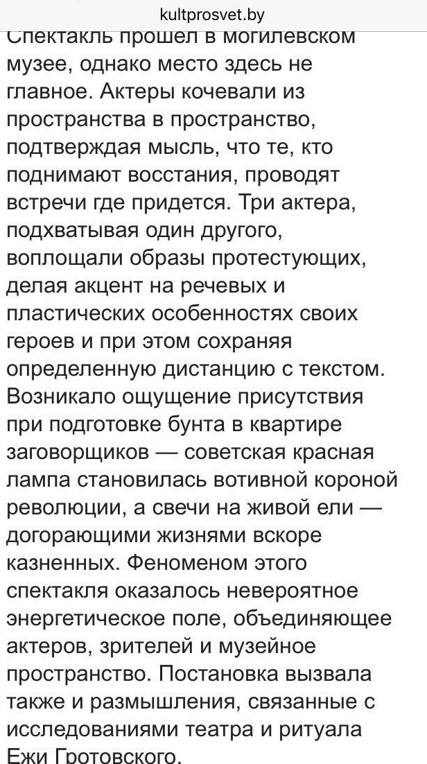 «Пируэт, исполненный актерским ансамблем спектакля, дорогого стоит. Заумная спираль, закрученная Клио, становится сюжетом. Метаморфозы, которые претерпело отношение к народовольцам в девятнадцатом, двадцатом и вот уже в двадцать первом веках, стали его живым нервом. Улицы, носившие имена террористов (Желябова, Перовской, Халтурина, Каляева), снова заголосили по-революционному. Зритель оказывается будто бы в музее-квартире заговорщиков. Их страстное стремление к свободе, пассионарная готовность к самопожертвованию обжигают — и тут же иронически переосмысляются лицедеями, в силу исторической дистанции знающими гораздо больше, чем их герои; возникает драматичное сопряжение с нашей эпохой тотального цинизма.”