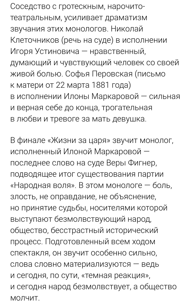 «Ценность этого спектакля еще в реабилитации людей. Не в реабилитации поступков, а в поминании целого поколения неравнодушных, обожженных людей, достойных любой оценки, включая осуждение, но не достойных забвения. Спектакль нам рассказывает не о том, что надо бороться с самодержавием, а том, как самодержавие доводит молодых и, безусловно, честных людей до радикализма. Мы, в самом деле, видим этот путь: как рассасывается иллюзия за иллюзией, как любая позитивная социальная деятельность разбивается о стенку равнодушия системы.»